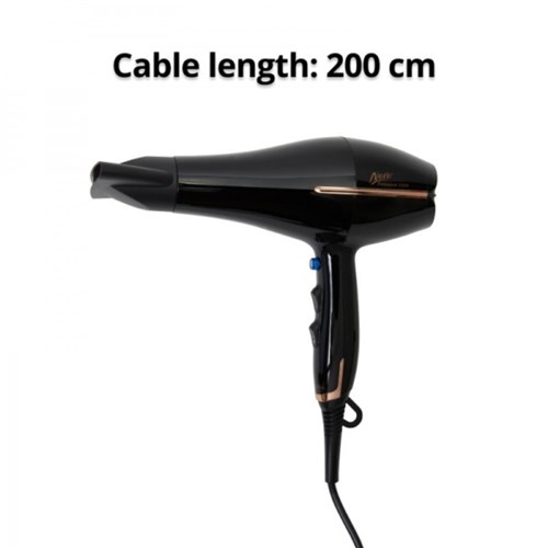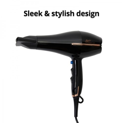 Salon quality with durable and quiet AC motor 3 heat, 2 speed settings Sleek & stylish design with included concentrator nozzle Removable rear cover for easy cleaning Auto shut off if overheated 2200W 200mm cable Black with copper trim AUS/NZ Electrical Safety Standards Approved. 2 year warranty