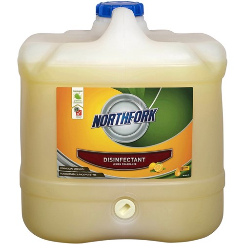 Environmentally preferable products certified by GECA, Good Environmental Choice Australia. Northfork Lemon Disinfectant is a one step cleaner, disinfectant and deodoriser in one, making it effective for use in toilets, washrooms and on bench tops. Safe to use on all washable surfaces. Pleasant Lemon fragrance. Non-flammable and non-hazardous. Biodegradable and Phosphate free.