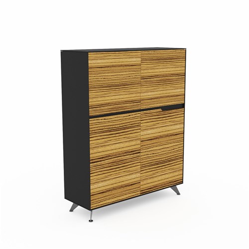 Novara Cabinet Cabinet with four Timber Veneer doors. Timber Veneer, Zebrano/Matt black 2 pack paint frame and aluminium feet.
