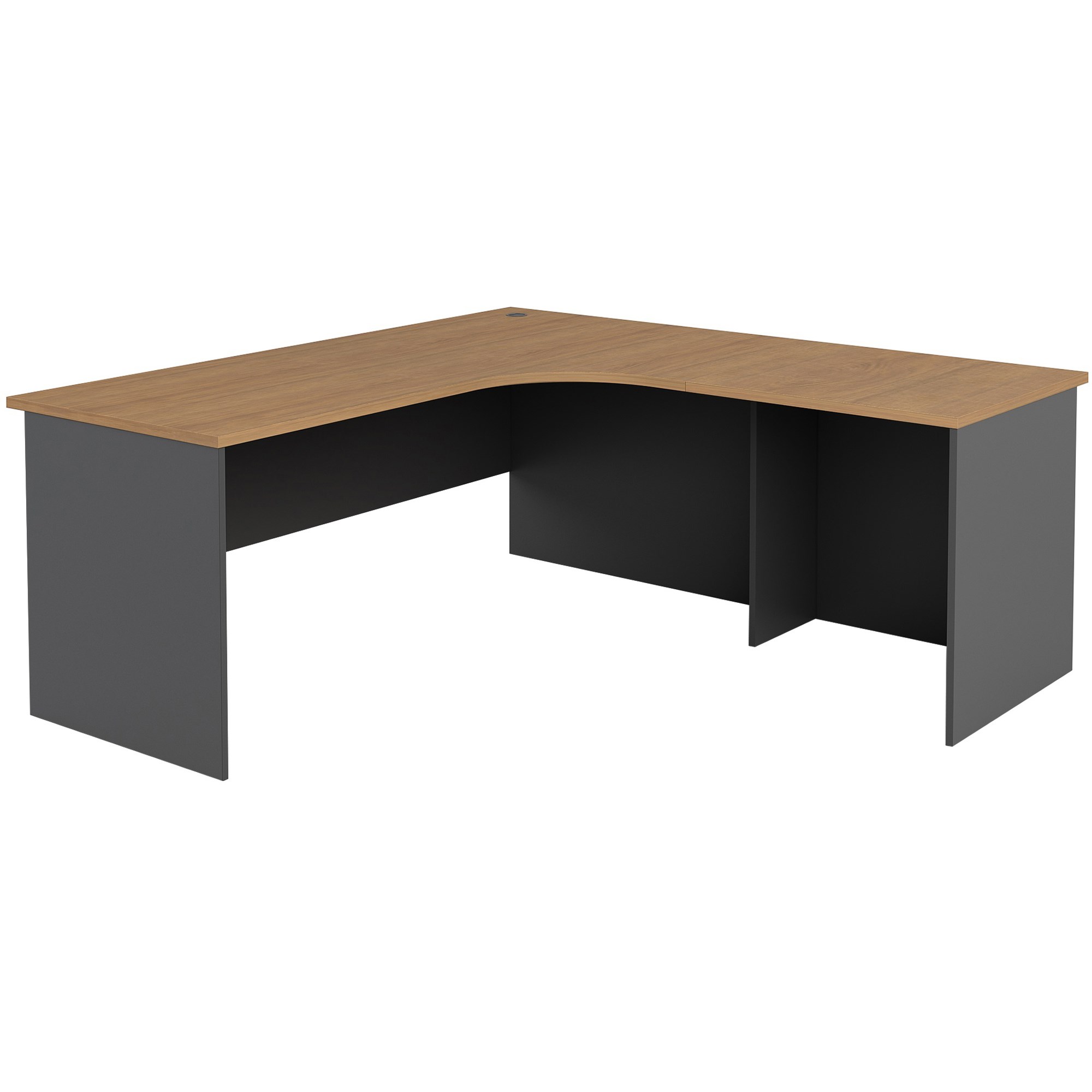 Made from high quality materials with a high quality finish. Unit Dimensions: 1800* 1800 x 700 x 720mm. Colour: Regal Walnut and Charcoal. 2 Piece Radial Workstation with RHS return.