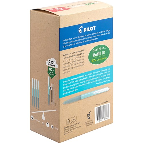 A slim line ballpoint with translucent turquoise body, housing a smooth oil-based writing ink that glides effortlessly from pen to paper. Features a rubberised grip for added writing comfort and is retractable to save on pen caps. Each Eco-pack contains 1 pen and 3 refills. Recycled materials use to make Ocean Plastic pens, including plastic waste from oceans. Recyclable packaging made from FSC certified paper that is sustainably sourced and fully recyclable. Printed with vegetable-based ink that is biodegradable. Ball diameter: Fine 0.7mm. Tip: Stainless steel.