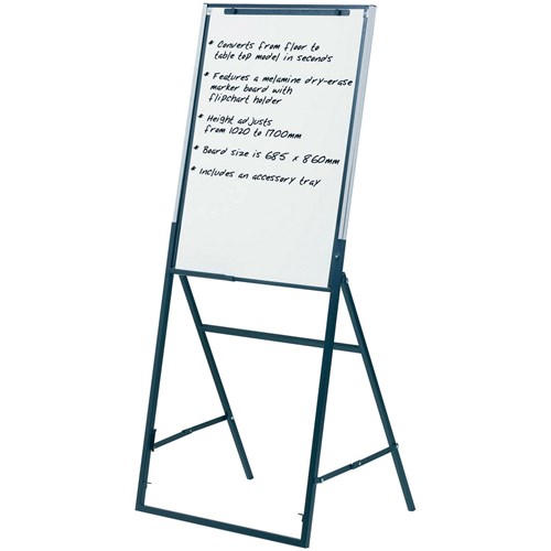 Combined whiteboard and flipchart easel in one. Adjustable from 1.02m to 1.7m high but folds away for easy storage. Features lockable cross braces on the legs to ensure sturdiness. Board dimensions 685x860mm.