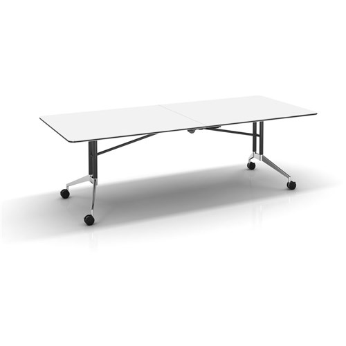 Rapid Edge Folding Boardroom Table - Natural White 2400mm W x 1000mm D x 743mm H Stylish Rubber Strip Edging to Table Top with Quick Release Flip Mechanism Includes 2 x Table Links Polished Aluminium Foot Heavy Duty Lockable Castors E1 Rated 18mm Thick Melamine Worksurface Black P/C Frame Adjustable Levelling Feet 5 Year Manufacturer's Warranty