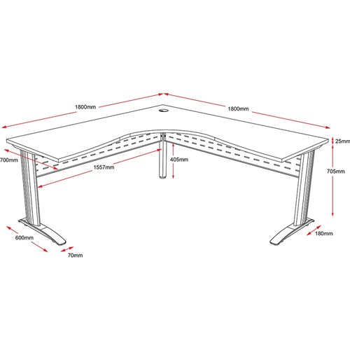 One piece corner workstation with 25mm top. Brushed silver, black or white metal leg. Perforated metal modesty panel. Delivery, installation and assembly charges may apply to furniture. Please enquire to confirm.