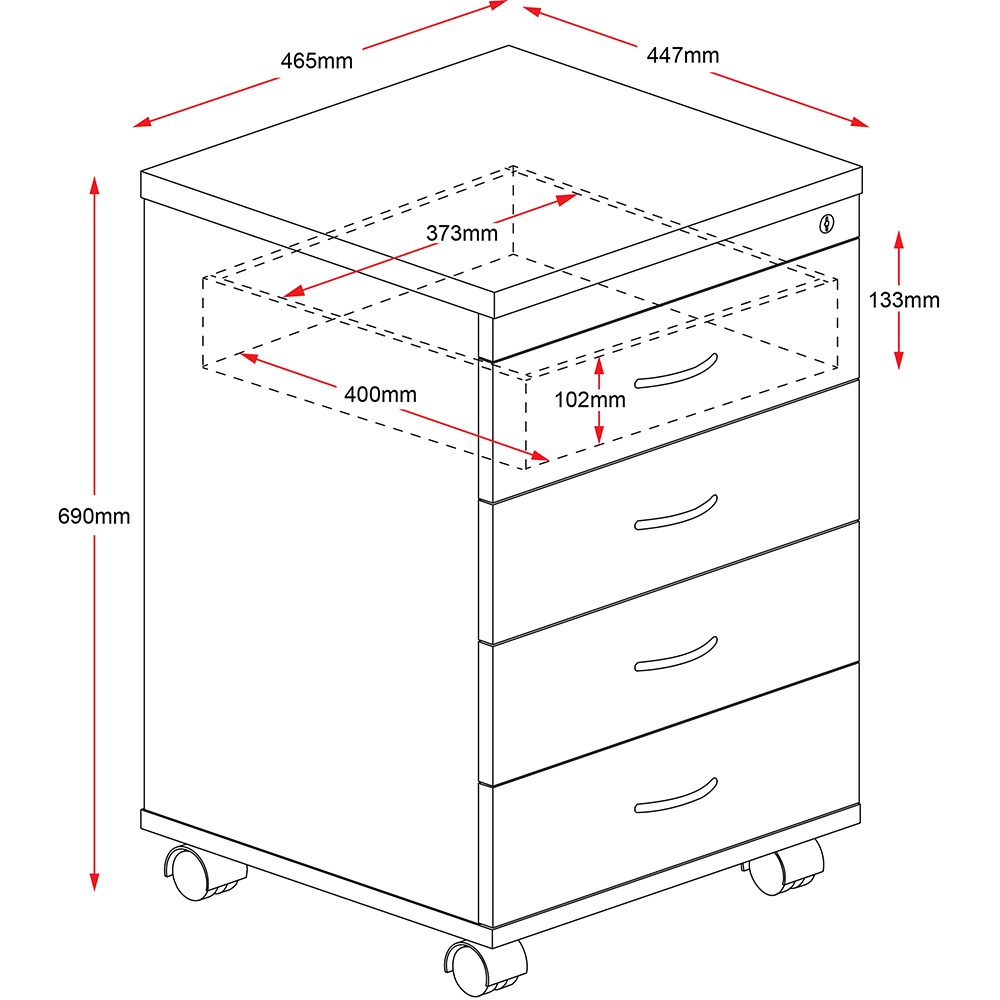 CMP2D1F 2 standard drawers I file drawer CMP4D 4 standard drawers CMP2F 2 file drawers Lockable. Metal Runners. Fifth Wheel for Stability. E0 Enviroboard. Maximum of 30kgs per drawer. Unit Dimension: 690mm H x465 mm W x 447 mm D. 5 Year Manufacturer's Warranty.