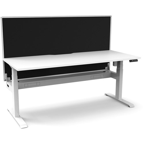 White top with White frame. Unit Dimension: 1800mm W x 750mm D x 1330mm H. 620-1270mm height range for desk. E0 rated top. Powdercoat base. Digital control panel with 3 pre-set positions, LED display panel, keypad safety lock & reminder alarm setting. Anti-collision technology, noise emission of less than 50DB. Lifting capacity of 80kg with a max speed of 25mm per second. 700mm wide foot size with adjustable leveling feet. Comes with 30mm thick privacy screens and cable tray for cable management. 10 Year Manufacturer's Warranty. Delivery, installation and assembly charges may apply to furniture. Please enquire to confirm.