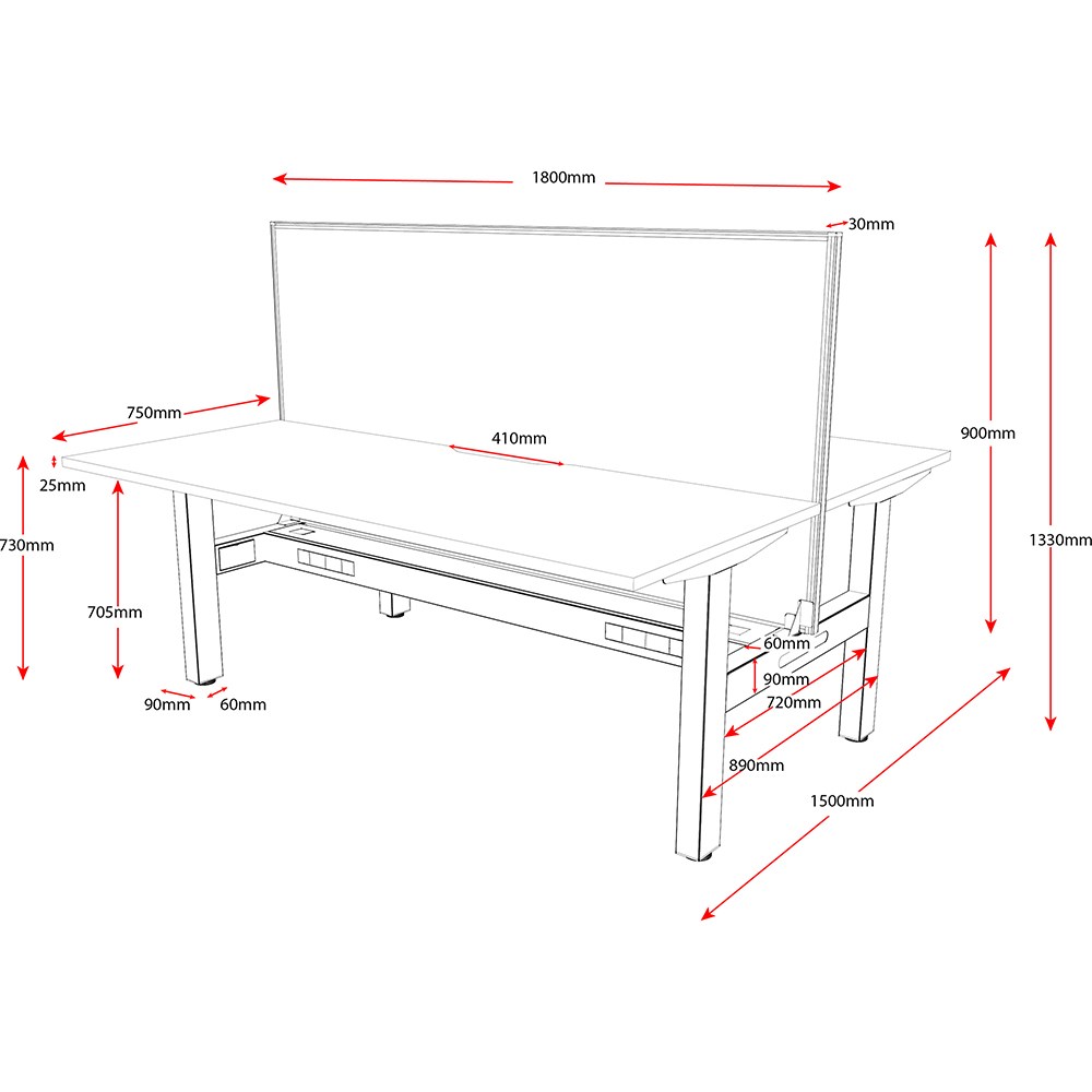 Fixed height desks to match the Boost+ range. White top with White frame. Unit Dimension: 1800mm W x 1500mm D x 1330mm H. Desk height 730mm. 750mm depth desk per user. E0 rated top. Powdercoat base. Comes with 30mm thick privacy screens and cable tray for cable management. 10 Year Manufacturer's Warranty. Delivery, installation and assembly charges may apply to furniture. Please enquire to confirm.
