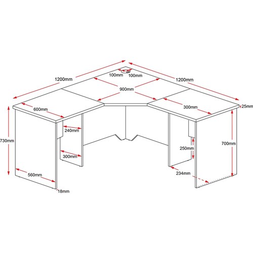 730mm H x 1800 mm W x 1200 mm D 3 piece Corner Workstation Matching Lockable Drawers, Mobile Pedestal and Hob Available As Extras E0 rated Enviroboard 5 Years Manufacturers Warranty