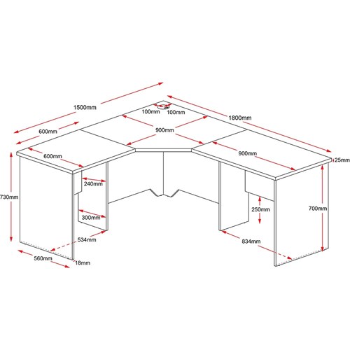 730mm H x 2100 mm W x 1500 mm D 3 piece Corner Workstation Matching Lockable Drawers, Mobile Pedestal and Hob Available As Extras E0 rated Enviroboard 5 Years Manufacturers Warranty