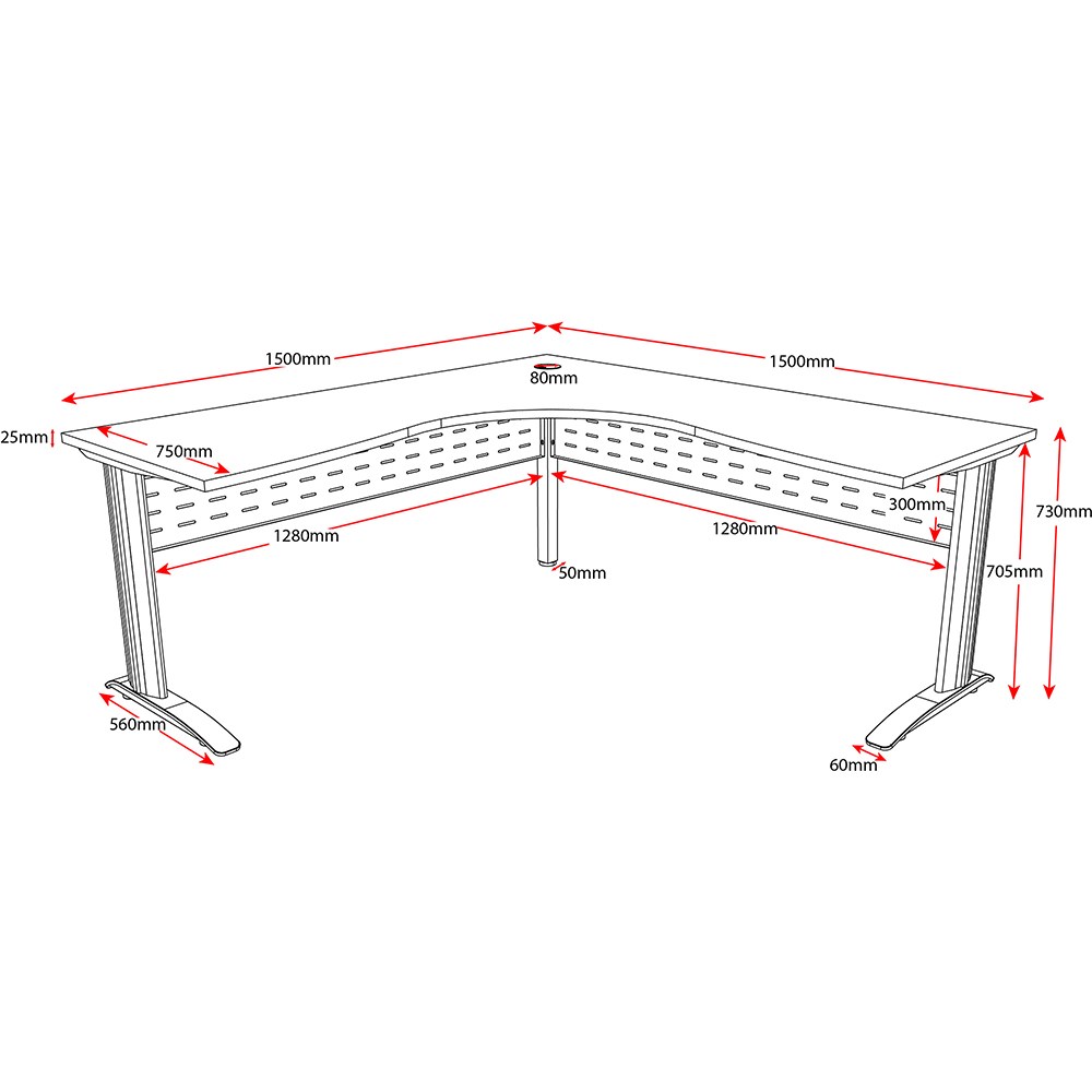 730mm H x1800 mm W x 1500 mm D Sturdy powder coated frame and legs Comes with metal perforated modesty panel Range of sizes to choose from to suit your space E0 rated Melamine top Scalloped edge for cable access 750mm Deep top for more workspace Hidden cable tidy in legs Adjustable feet Use with Deluxe Infinity storage.