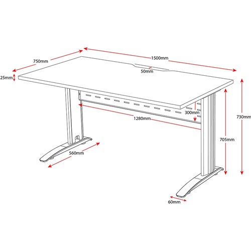 Sturdy powder coated frame and legs Comes with metal perforated modesty panel Range of sizes to choose from to suit your space E0 rated Melamine top Scalloped edge for cable access 750mm Deep top for more workspace Hidden cable tidy in legs Adjustable feet Use with Deluxe Infinity storage. 5 Years Manufacturers Warranty