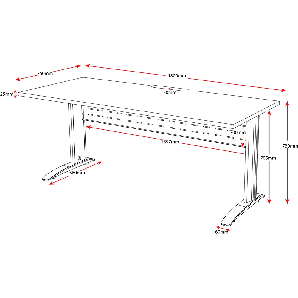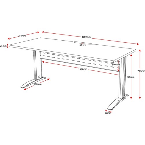 Sturdy powder coated frame and legs Comes with metal perforated modesty panel Range of sizes to choose from to suit your space E0 rated Melamine top Scalloped edge for cable access 750mm Deep top for more workspace Hidden cable tidy in legs Adjustable feet Use with Deluxe Infinity storage. 5 Years Manufacturers Warranty