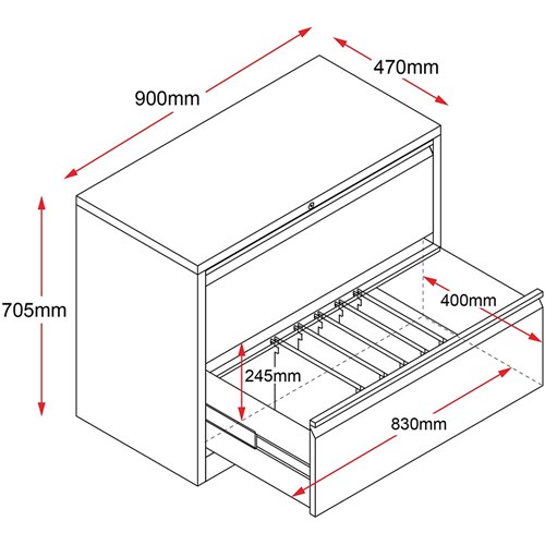 Go Lateral filing cabinets allow 2 rows of Foolscap files per drawer and fit seamlessly into a workstation layout. Riveted Construction for Extra Strength. Anti Tilt Locking. Master key locking. Keyed alike locks optional extra. Heavy Duty Ballbearing Runners. Two Rows of Foolscap Folders per Drawer - 2 Drawer Cabinet. Weight limit of 60kgs per drawer. Comes Fully assembled. Unit Dimensions: 705mm H x900 mm W x 473 mm D. 10 Year Manufacturer's warranty.
