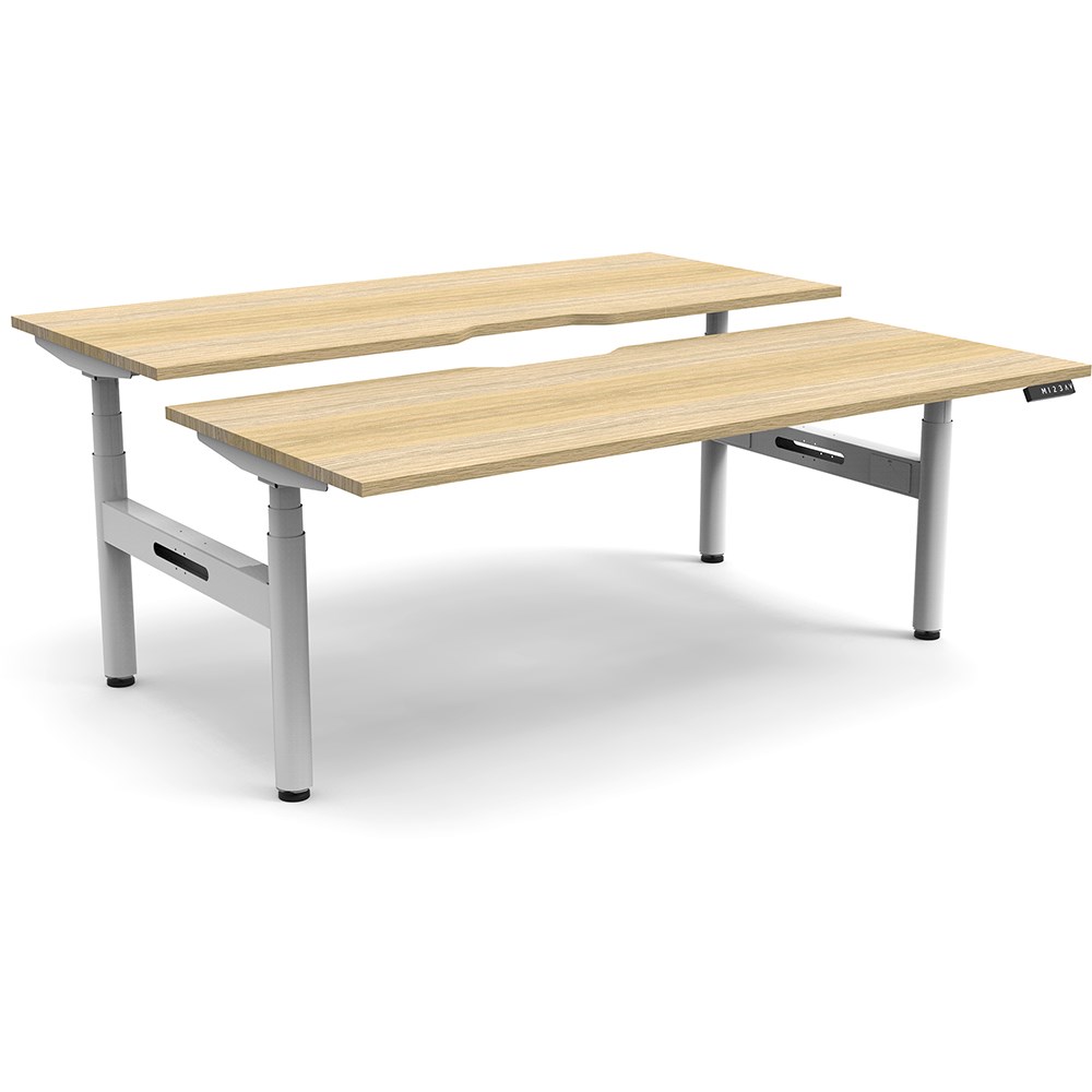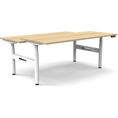 Natural Oak top with White frame. Unit Dimension: 1500mm W x 1500mm D x 620-1270mm H. 750mm depth per user. E0 rated top. Powdercoat base. Digital control panel with 3 pre-set positions, LED display panel, keypad safety lock & reminder alarm setting. Anti-collision technology, noise emission of less than 50DB. Lifting capacity of 120kg with a max speed of 38mm per second. 70mm diameter round column legs. 700mm wide foot size with adjustable leveling feet, return foot: 700mm. 10 Year Manufacturer's Warranty. Delivery, installation and assembly charges may apply to furniture. Please enquire to confirm.