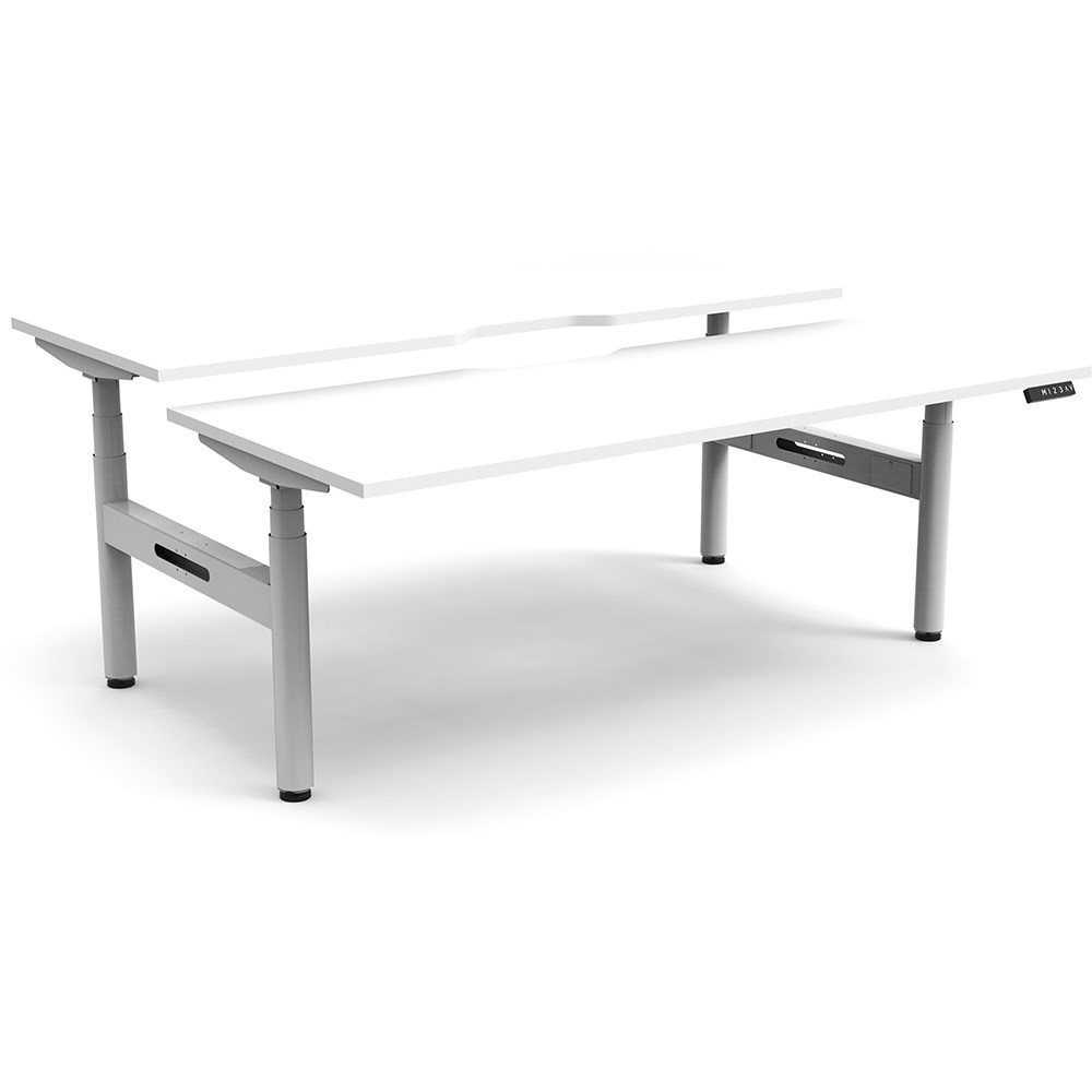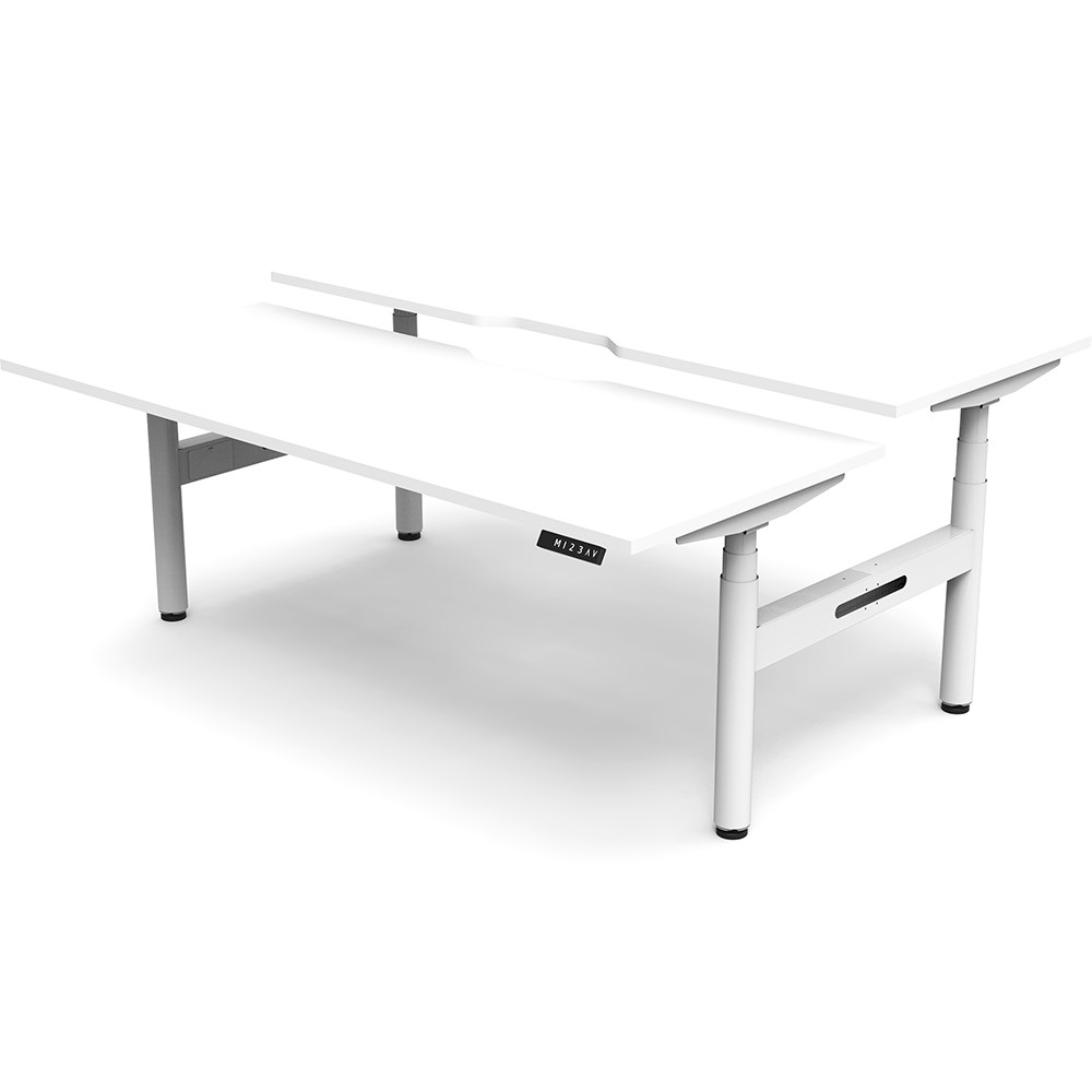 White top with White frame. Unit Dimension: 1800mm W x 1500mm D x 620-1270mm H. 750mm depth per user. E0 rated top. Powdercoat base. Digital control panel with 3 pre-set positions, LED display panel, keypad safety lock & reminder alarm setting. Anti-collision technology, noise emission of less than 50DB. Lifting capacity of 120kg with a max speed of 38mm per second. 70mm diameter round column legs. 700mm wide foot size with adjustable leveling feet, return foot: 700mm. 10 Year Manufacturer's Warranty. Delivery, installation and assembly charges may apply to furniture. Please enquire to confirm.