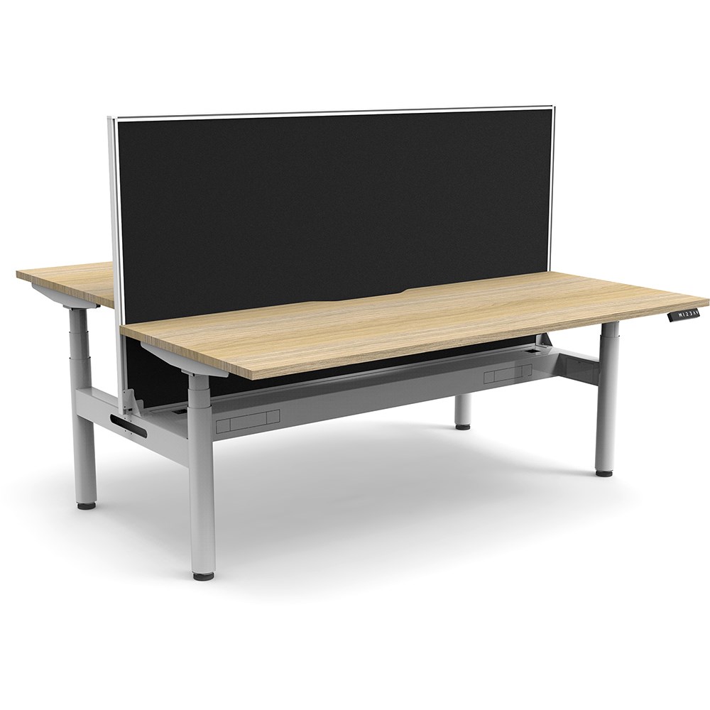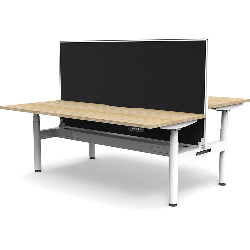 Natural Oak top with White frame. Unit Dimension: 1500mm W x 1500mm D x 1330mm H. 620-1270mm height range for desk, 750mm depth per user. E0 rated top. Powdercoat base. Digital control panel with 3 pre-set positions, LED display panel, keypad safety lock & reminder alarm setting. Anti-collision technology, noise emission of less than 50DB. Lifting capacity of 120kg with a max speed of 38mm per second. 70mm diameter round column legs. 700mm wide foot size with adjustable leveling feet, return foot: 700mm. Comes with 30mm thick privacy screens and cable tray for cable management. 10 Year Manufacturer's Warranty. Delivery, installation and assembly charges may apply to furniture. Please enquire to confirm.