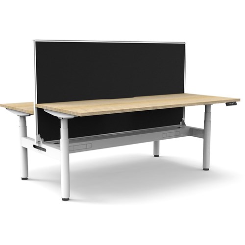Natural Oak top with White frame. Unit Dimension: 1800mm W x 1500mm D x 1330mm H. 620-1270mm height range for desk, 750mm depth per user. E0 rated top. Powdercoat base. Digital control panel with 3 pre-set positions, LED display panel, keypad safety lock & reminder alarm setting. Anti-collision technology, noise emission of less than 50DB. Lifting capacity of 120kg with a max speed of 38mm per second. 70mm diameter round column legs. 700mm wide foot size with adjustable leveling feet, return foot: 700mm. Comes with 30mm thick privacy screens and cable tray for cable management. 10 Year Manufacturer's Warranty. Delivery, installation and assembly charges may apply to furniture. Please enquire to confirm.