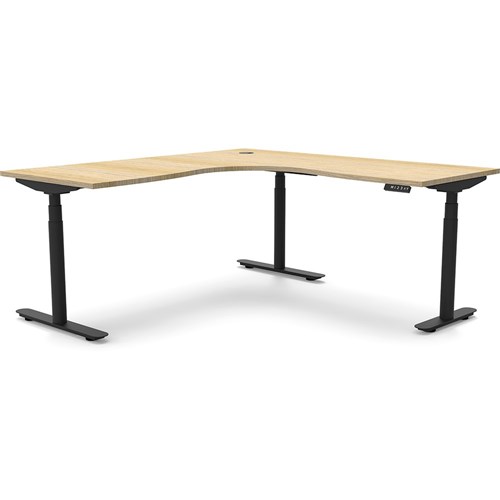 Natural Oak top with Black frame. Unit Dimension: 1500/1500mm W x 750mm D x 620-1270mm H. E0 rated top. Powdercoat base. Digital control panel with 3 pre-set positions, LED display panel, keypad safety lock & reminder alarm setting. Anti-collision technology, noise emission of less than 50DB. Lifting capacity of 120kg with a max speed of 38mm per second. 70mm diameter round column legs. 700mm wide foot size with adjustable leveling feet, return foot: 700mm. 10 Year Manufacturer's Warranty. Delivery, installation and assembly charges may apply to furniture. Please enquire to confirm.