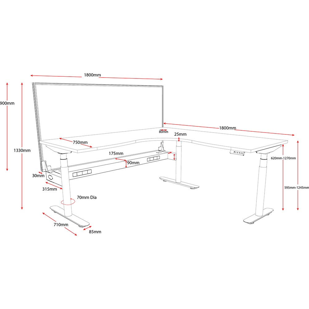 Natural Oak top with Black frame. Unit Dimension: 1800/1800mm W x 750mm D x 620-1270mm H. E0 rated top. Powdercoat base. Digital control panel with 3 pre-set positions, LED display panel, keypad safety lock & reminder alarm setting. Anti-collision technology, noise emission of less than 50DB. Lifting capacity of 120kg with a max speed of 38mm per second. 70mm diameter round column legs. 700mm wide foot size with adjustable leveling feet, return foot: 700mm. Comes with cable tray for cable management. 10 Year Manufacturer's Warranty. Delivery, installation and assembly charges may apply to furniture. Please enquire to confirm.