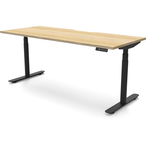 Natural Oak top with Black frame. Unit Dimension: 1800mm W x 750mm D x 620-1270mm H. E0 rated top. Powdercoat base. Digital control panel with 3 pre-set positions, LED display panel, keypad safety lock & reminder alarm setting. Anti-collision technology, noise emission of less than 50DB. Lifting capacity of 120kg with a max speed of 38mm per second. 70mm diameter round column legs. 700mm wide foot size with adjustable leveling feet, return foot: 700mm. 10 Year Manufacturer's Warranty. Delivery, installation and assembly charges may apply to furniture. Please enquire to confirm.