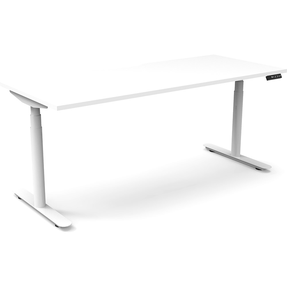 White top with White frame. Unit Dimension: 1800mm W x 750mm D x 620-1270mm H. E0 rated top. Powdercoat base. Digital control panel with 3 pre-set positions, LED display panel, keypad safety lock & reminder alarm setting. Anti-collision technology, noise emission of less than 50DB. Lifting capacity of 120kg with a max speed of 38mm per second. 70mm diameter round column legs. 700mm wide foot size with adjustable leveling feet, return foot: 700mm. 10 Year Manufacturer's Warranty. Delivery, installation and assembly charges may apply to furniture. Please enquire to confirm.