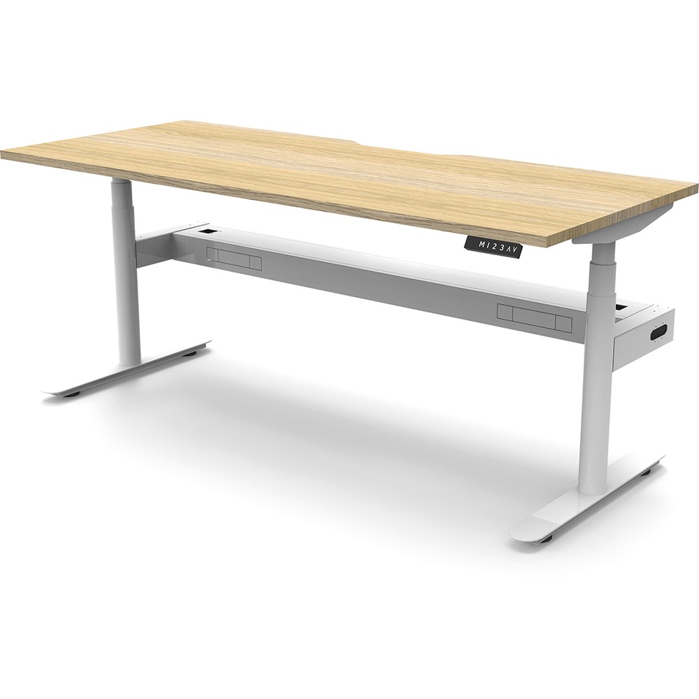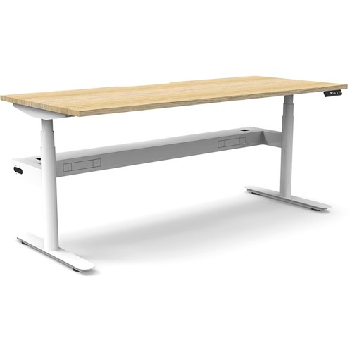 Natural Oak top with White frame. Unit Dimension: 1500mm W x 750mm D x 620-1270mm H. Comes with cable tray for cable management. E0 rated top. Powdercoat base. Digital control panel with 3 pre-set positions, LED display panel, keypad safety lock & reminder alarm setting. Anti-collision technology, noise emission of less than 50DB. Lifting capacity of 120kg with a max speed of 38mm per second. 70mm diameter round column legs. 700mm wide foot size with adjustable leveling feet, return foot: 700mm. Comes with cable tray for cable management. 10 Year Manufacturer's Warranty. Delivery, installation and assembly charges may apply to furniture. Please enquire to confirm.