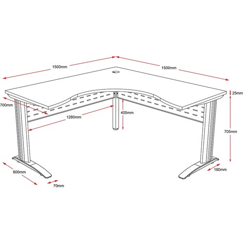 730mm H x1800 mm W x 1500 mm D Sturdy powder coated frame and legs One Piece Top with Cable Entry Holes for cable management E0 rated Enviroboard Tops Metal Powder coated Leg available in 3 colours Cable Tidy Management System in Leg Adjustable Feet Perforated Metal Modesty Panel 5 Years Manufacturers Warranty
