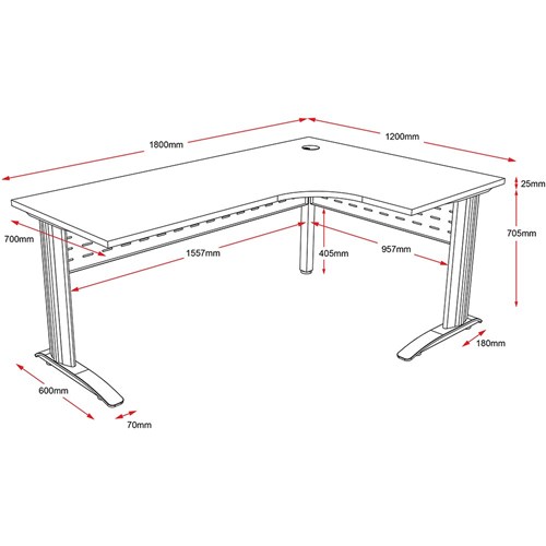 730mm H x1800 mm W x 1800 mm D Sturdy powder coated frame and legs One Piece Top with Cable Entry Holes for cable management E0 rated Enviroboard Tops Metal Powder coated Leg available in 3 colours Cable Tidy Management System in Leg Adjustable Feet Perforated Metal Modesty Panel 5 Years Manufacturers Warranty