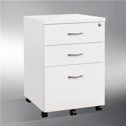 Mobile Pedestal, 2 pencil drawers and 1 filing drawer, with multi lock. Finished in high quality 2 pack matt white paint Pedestal Body Handle-Chrome