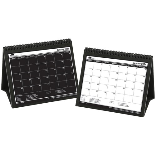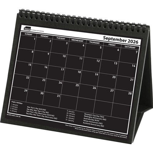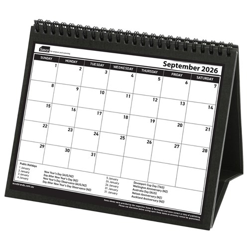 Stylish desk calendar to sit on your desk at the office or at home. Two options available- black viewing pages or white(on reverse side). One month per page format. National public holidays (aust and nz) included. Folds open to stand by itself on desktop. Dimensions: 210 x 180mm.