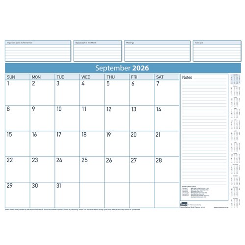 12 month planner refill for the sasco deluxe desk planner. One month per page January - December. Features a 12 month reference and large area for notes. National public holidays listed. Dimensions: 512 x 376mm.