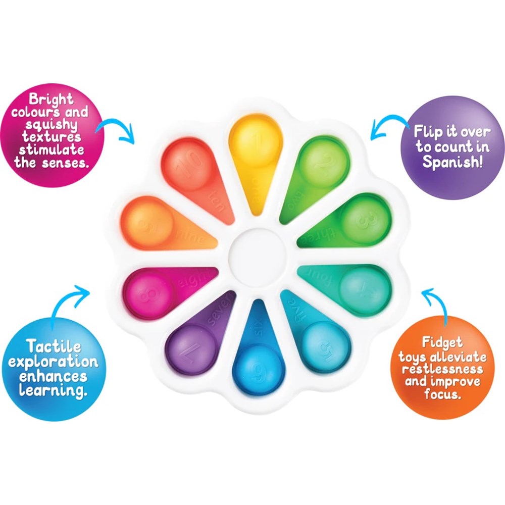 Sensory Sprouts Pop-It Wheel: Learn, Pop and Play in Two Languages! Spin into sensory fun with the Sensory Sprouts Pop-It Wheel! This colourful, flower-shaped fidget toy features popping bubbles with English numbers on one side and Spanish on the other, making learning bilingual numbers interactive and exciting. Perfect for little fingers to press, pop and count, it’s a fantastic tool for early learning, sensory exploration and stress relief. Get ready to pop, learn and play