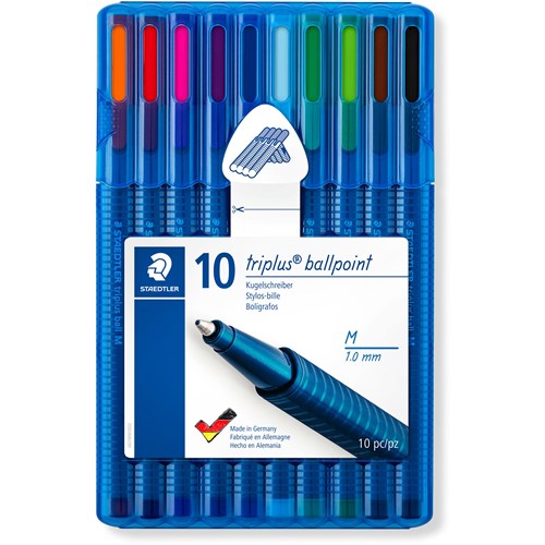 A wallet of 10 assorted colours in extra broad line width Ballpoint pen with ergonomic triangular barrel for relaxed and easy writing Smooth writing feeling due to low viscosity ink Quick-dry ink avoids smudging even when highlighted Airplane safe