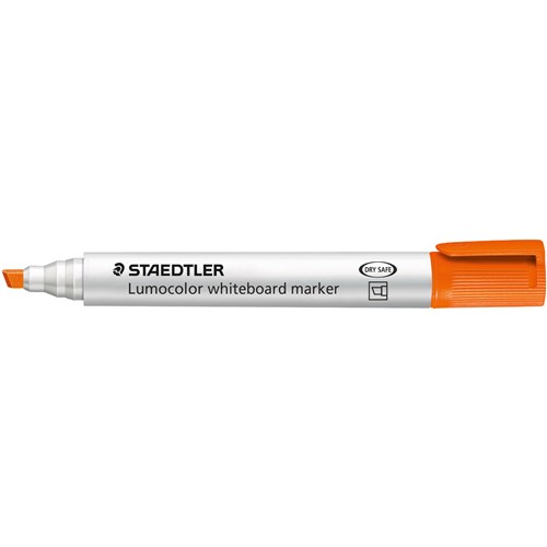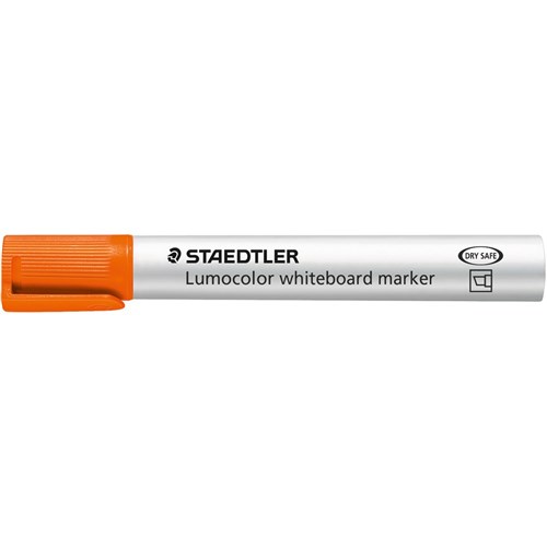 Orange marker can be dry-wiped from whiteboards and surfaces such as glass and porcelain without leaving a trace Airplane-safe Fast drying, low odour and with convenient clip cap Dry safe Stand-up Staedtler box converts to convenient desk set Refillable xylene and toluene free ink Polypropylene barrel and cap guarantee long service life Chisel tip line width approximately 2 - 5mm