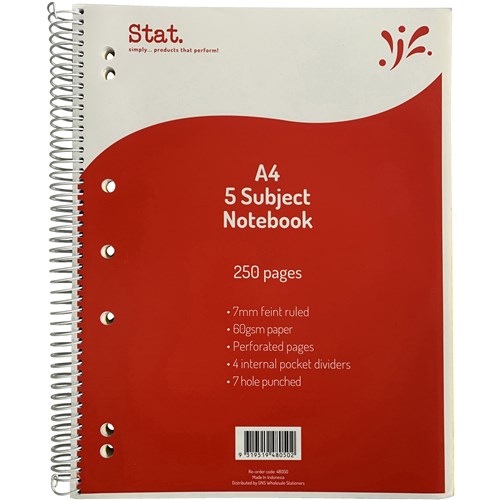 Stat Notebook A4 5 Subject 60Gsm 7Mm Ruled Red 250P