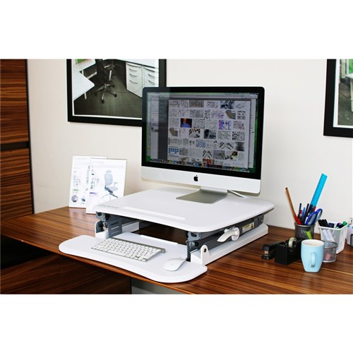 Gas spring offers smooth supported height transition. Easy height adjustment via two activation paddles. 3 hole mounts for easy-fit single or dual monitor arm. Support groove on the surface to mount smart phone & tablet. 2 widths available 15kg weight capacity. Dimensions: 680W x 580D x 150 500mmH. 10 year Manufacturer's Warranty.
