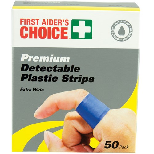 Visually detectable. Strips are electromagnetically detectable. Waterproof adhesive. Specifically designed for the food industry. Sterile.
