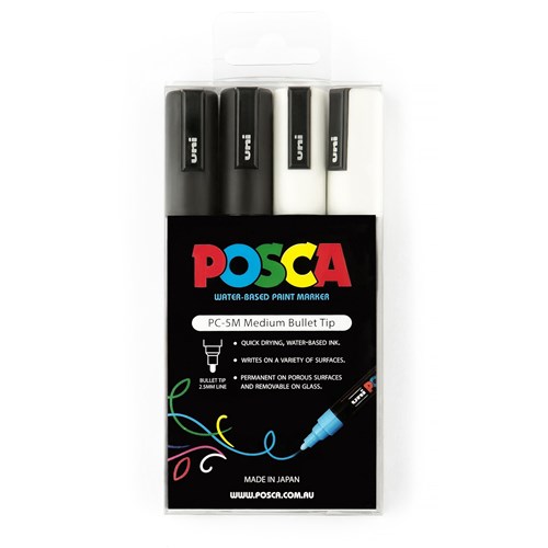 Uni Posca Pc-5M Paint Marker Bullet Medium 2.5Mm Black And White Pack Of 4