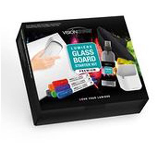 Glassboard Starter Kit is made up of: Cleaning Fluid Pen Cup Eraser Black Cloth 6 Markers