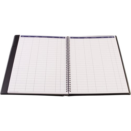 • Wiro bound corporate visitors book with padded PVC cover, 64 sheets and pen loop.